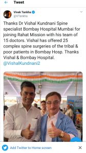Dr. Vishal Kundnani and Spine team will perform advanced spine surgery of poor and tribals in Mumbai in the coming months to support the vision and mission of Raahat camp.